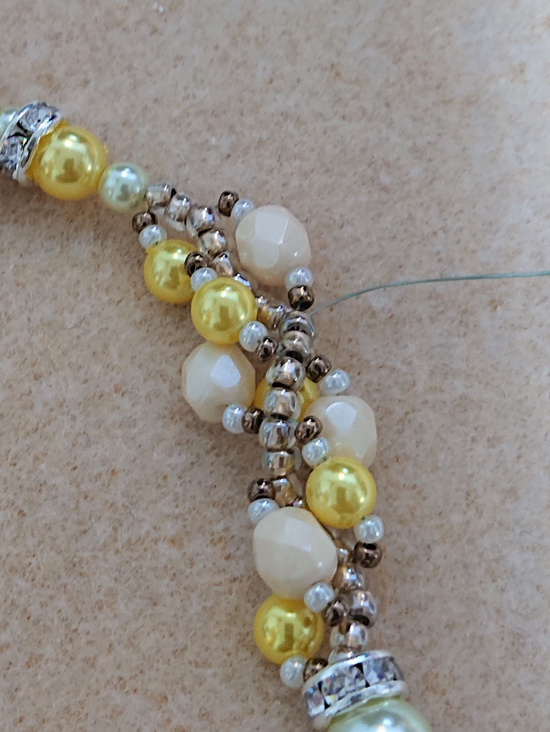 ・パール6㎜を5個、FPを4個を先に用意し、レシピ通り、スパーらるロープ部分を(A)(B)を繰り返し9段編む